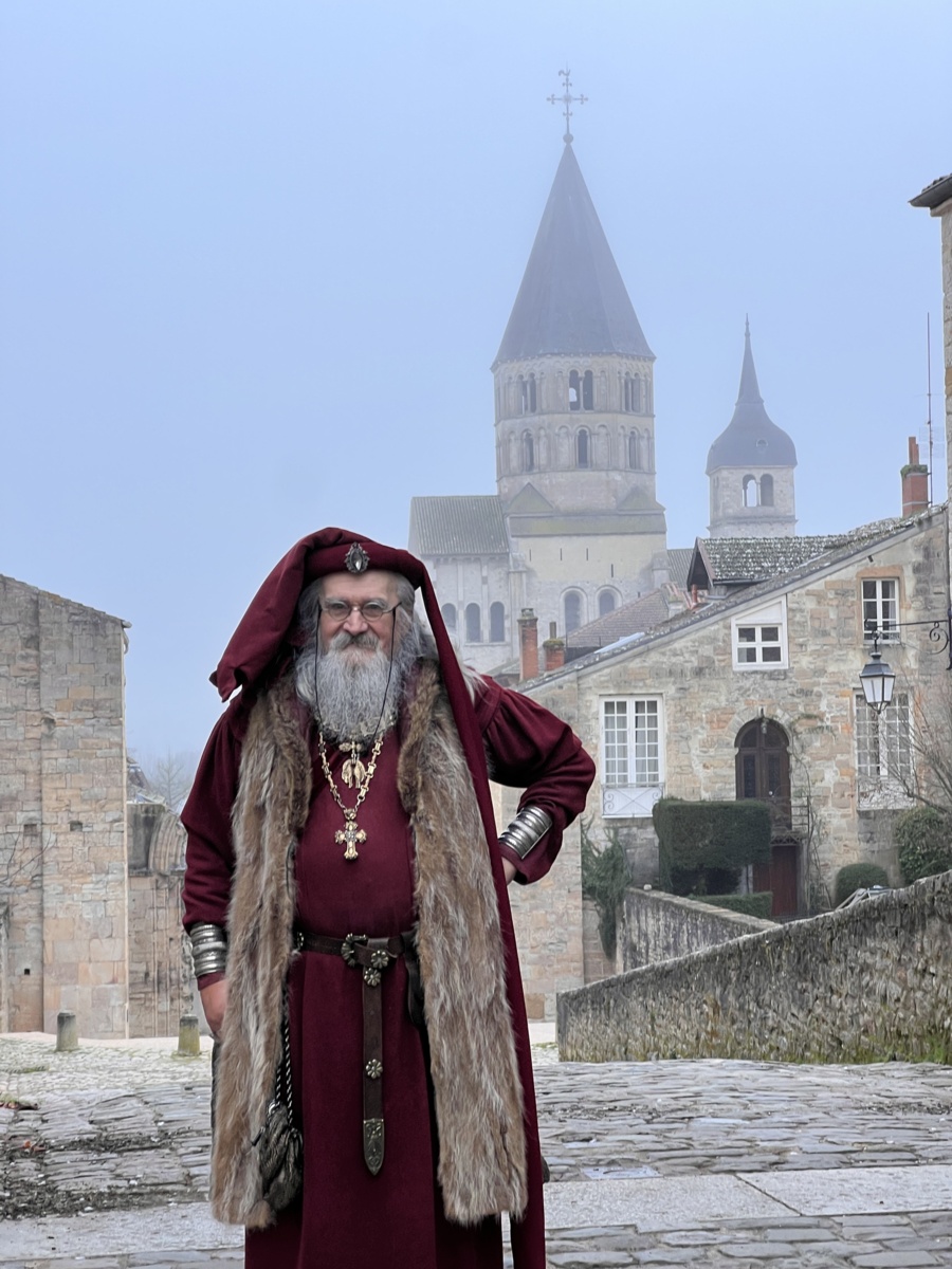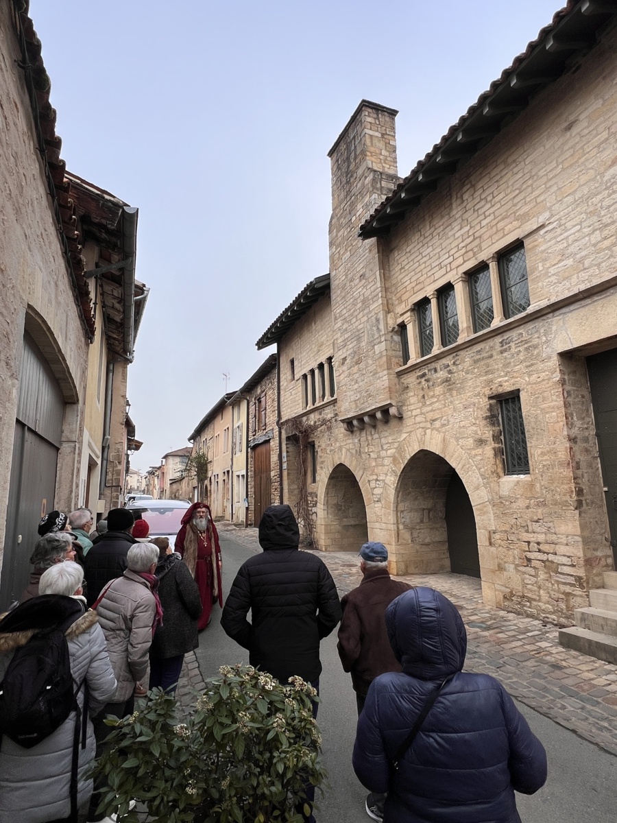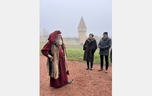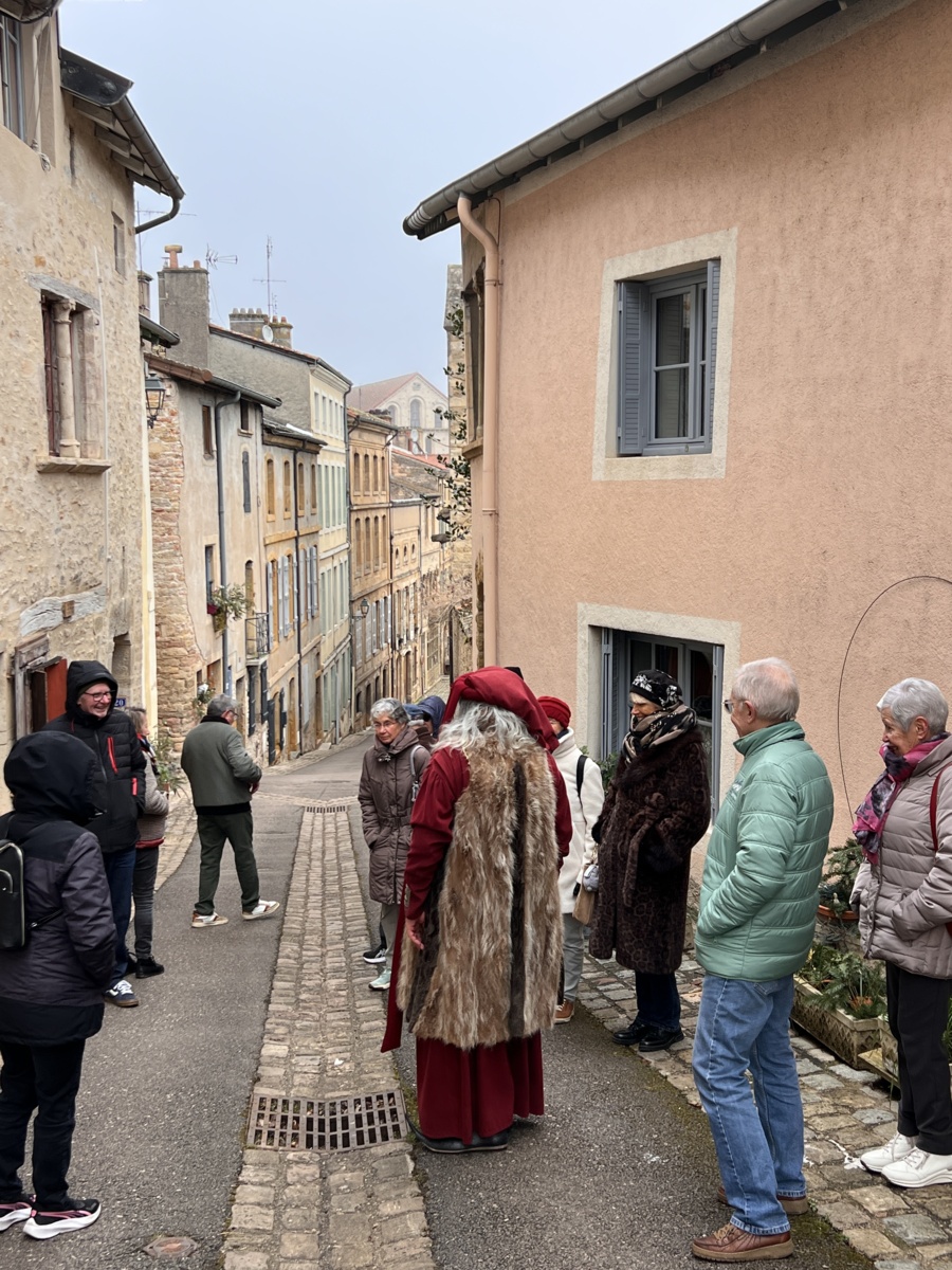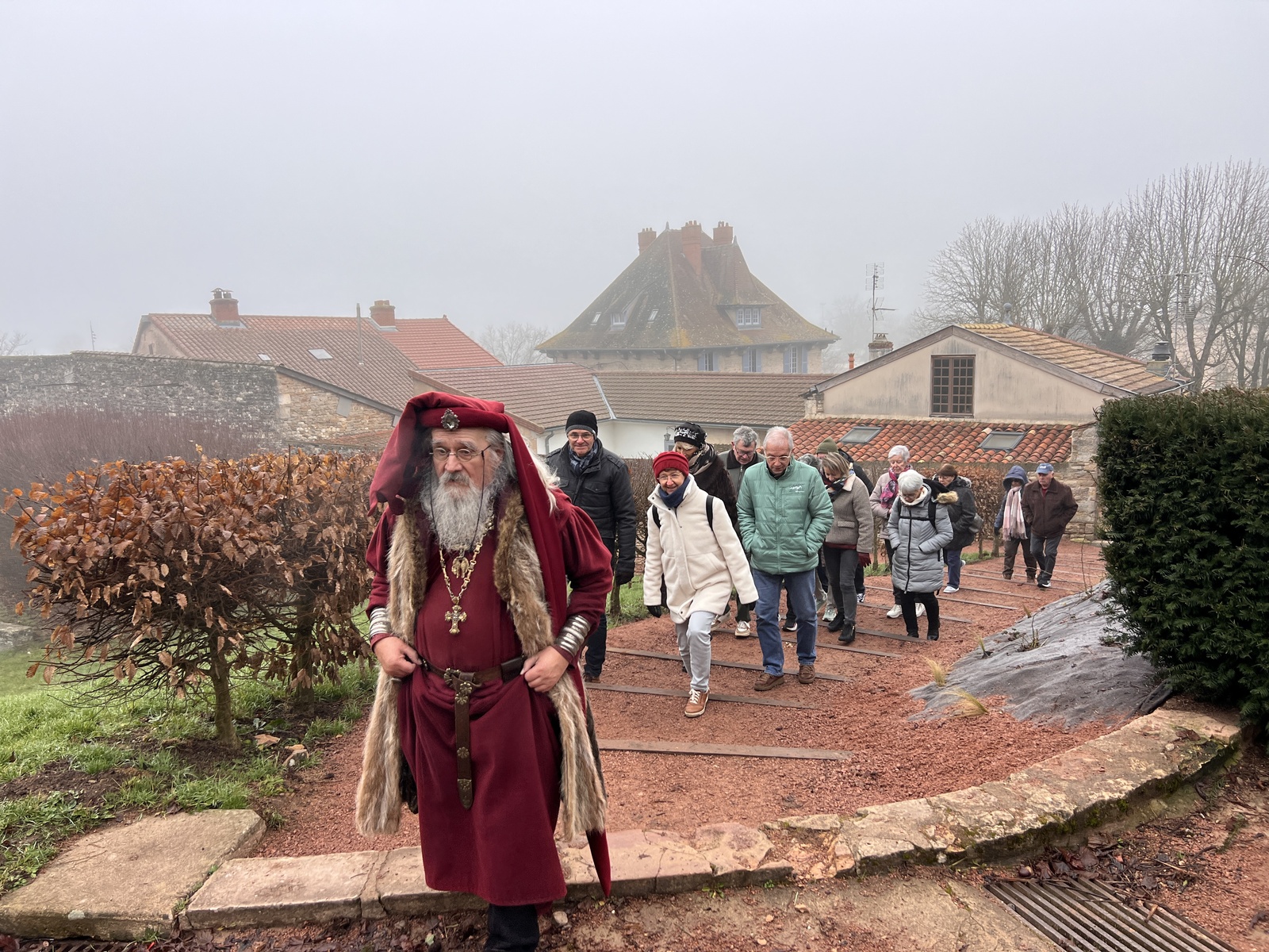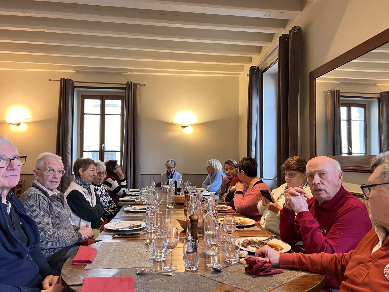 Nous avions fait la route depuis Bourg avec le brouillard, alors imaginez notre surprise de voir un personnage arrivé directement de 1425 sur le parking de Cluny avec un costume d'époque et tous les attribut de la Toison d'Or ! C'était notre guide pour la journée et nous l'avons suivi le matin dans la vieille ville qu'il a su nous raconter depuis son époque en nous faisant presque oublier le froid et l'humidité de cette journée glaciale. Midi était le bienvenu encore plus pour la chaleur du restaurant que pour l'excellent repas que nous y avons trouvé. Civet de sanglier et autres plats en sauce au choix nous ont bien réchauffé. Les bons desserts maison ont été également bien appréciés dont le tiramisu revisité maison 1425 qui faisait penser à la charlotte d'aujourd'hui. Nous avons pu repartir découvrir l'abbaye avec 2 films sur son histoire et la visite commentée des pierres encore visibles. La journée s'est terminée par le musée de l'Ecole des Arts et Métiers présenté par un Ancien Elève Promo 1963 ... Après un grand MERCI à René pour l'organisation parfaite de ces visites nous sommes rentrés à Ceyzériat fatigués mais très contents de cette journée conviviale.