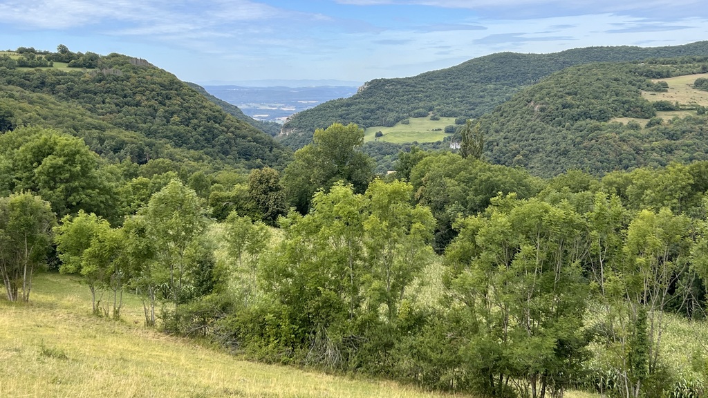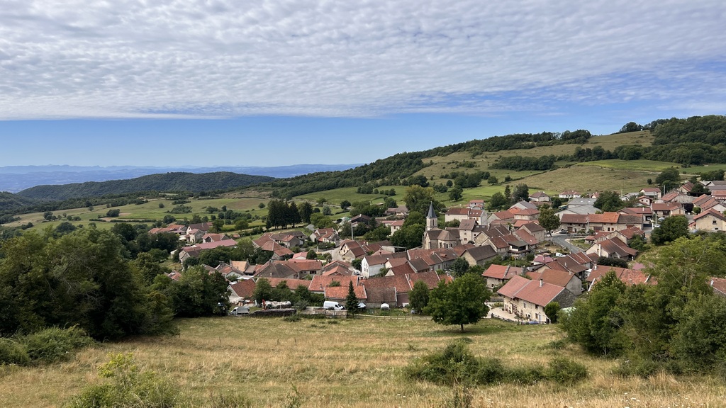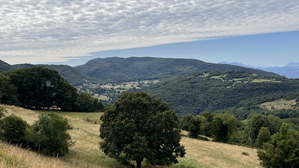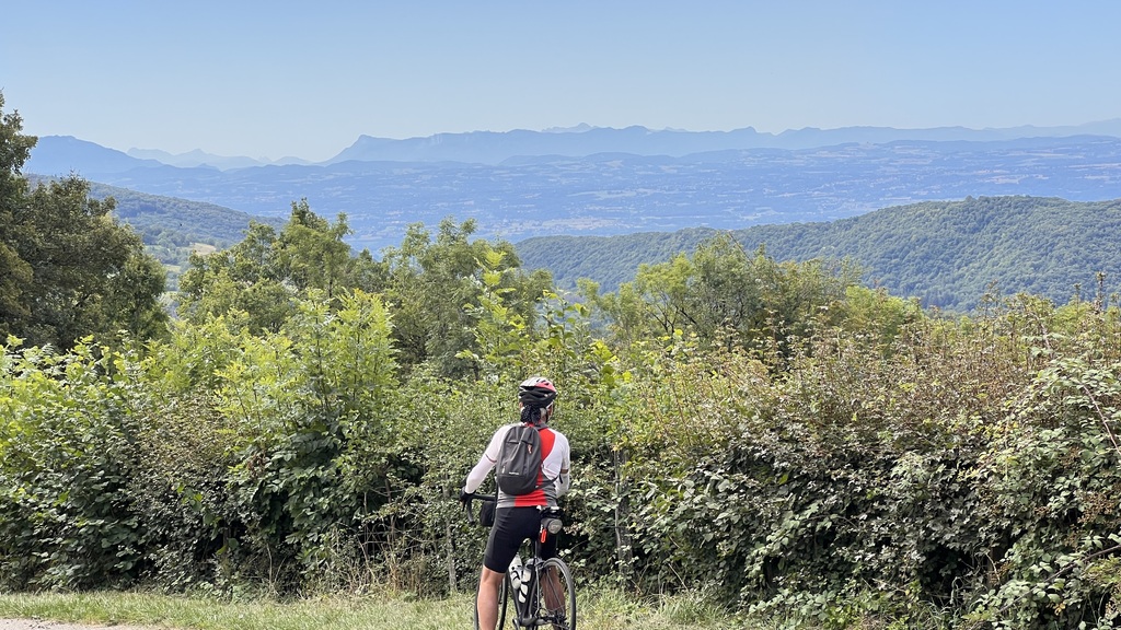 Découverte des villages et paysages du Bas Bugey de St Rambert à Lhuis par Arandas Ordonnaz Lompnaz Cerin en balcon au dessus des Terres Froides Isèroises et avec les des Alpes en panorama.