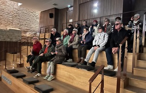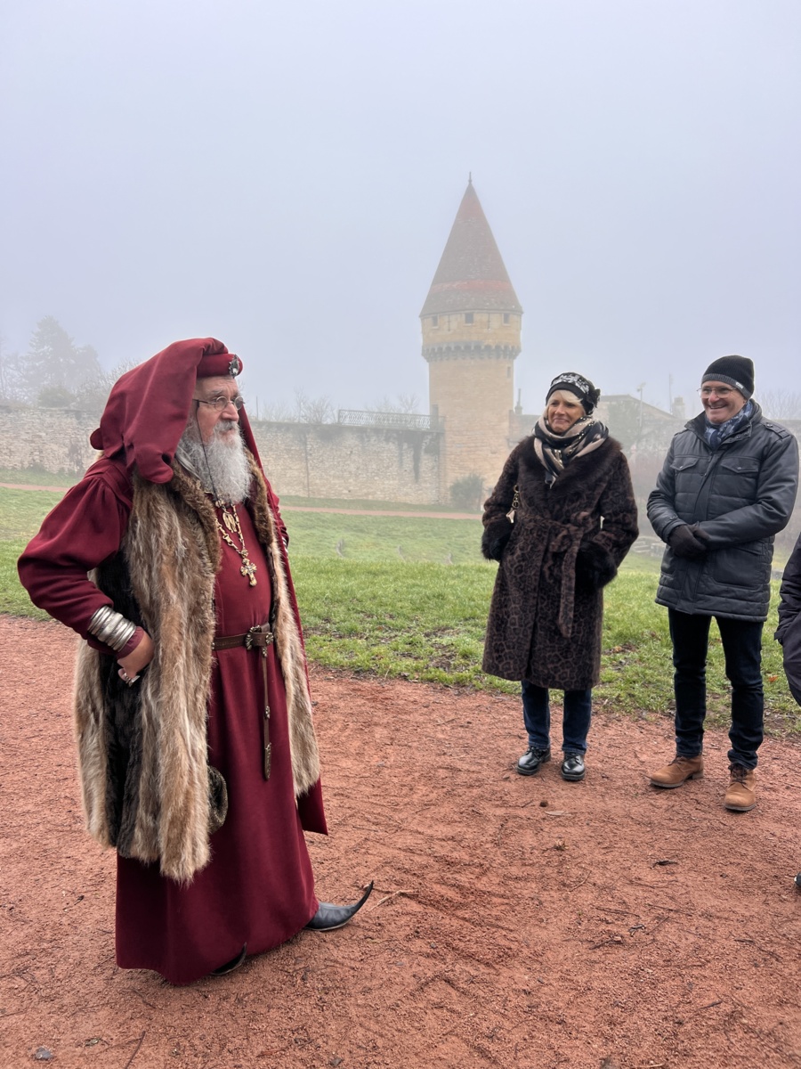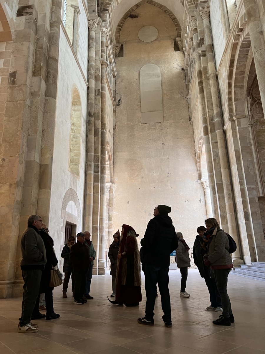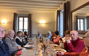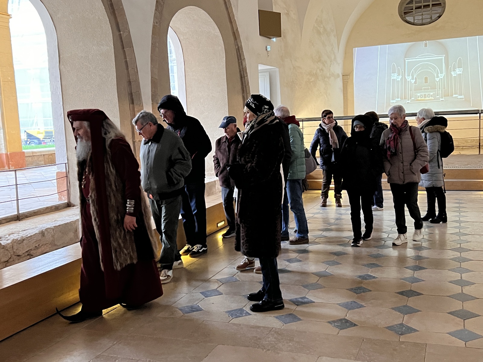 Nous avions fait la route depuis Bourg avec le brouillard, alors imaginez notre surprise de voir un personnage arrivé directement de 1425 sur le parking de Cluny avec un costume d'époque et tous les attribut de la Toison d'Or ! C'était notre guide pour la journée et nous l'avons suivi le matin dans la vieille ville qu'il a su nous raconter depuis son époque en nous faisant presque oublier le froid et l'humidité de cette journée glaciale. Midi était le bienvenu encore plus pour la chaleur du restaurant que pour l'excellent repas que nous y avons trouvé. Civet de sanglier et autres plats en sauce au choix nous ont bien réchauffé. Les bons desserts maison ont été également bien appréciés dont le tiramisu revisité maison 1425 qui faisait penser à la charlotte d'aujourd'hui. Nous avons pu repartir découvrir l'abbaye avec 2 films sur son histoire et la visite commentée des pierres encore visibles. La journée s'est terminée par le musée de l'Ecole des Arts et Métiers présenté par un Ancien Elève Promo 1963 ... Après un grand MERCI à René pour l'organisation parfaite de ces visites nous sommes rentrés à Ceyzériat fatigués mais très contents de cette journée conviviale.